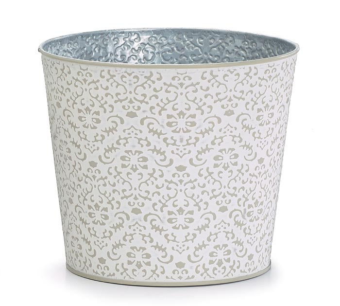 Embossed Tin Gray & White Flower Pot 6"