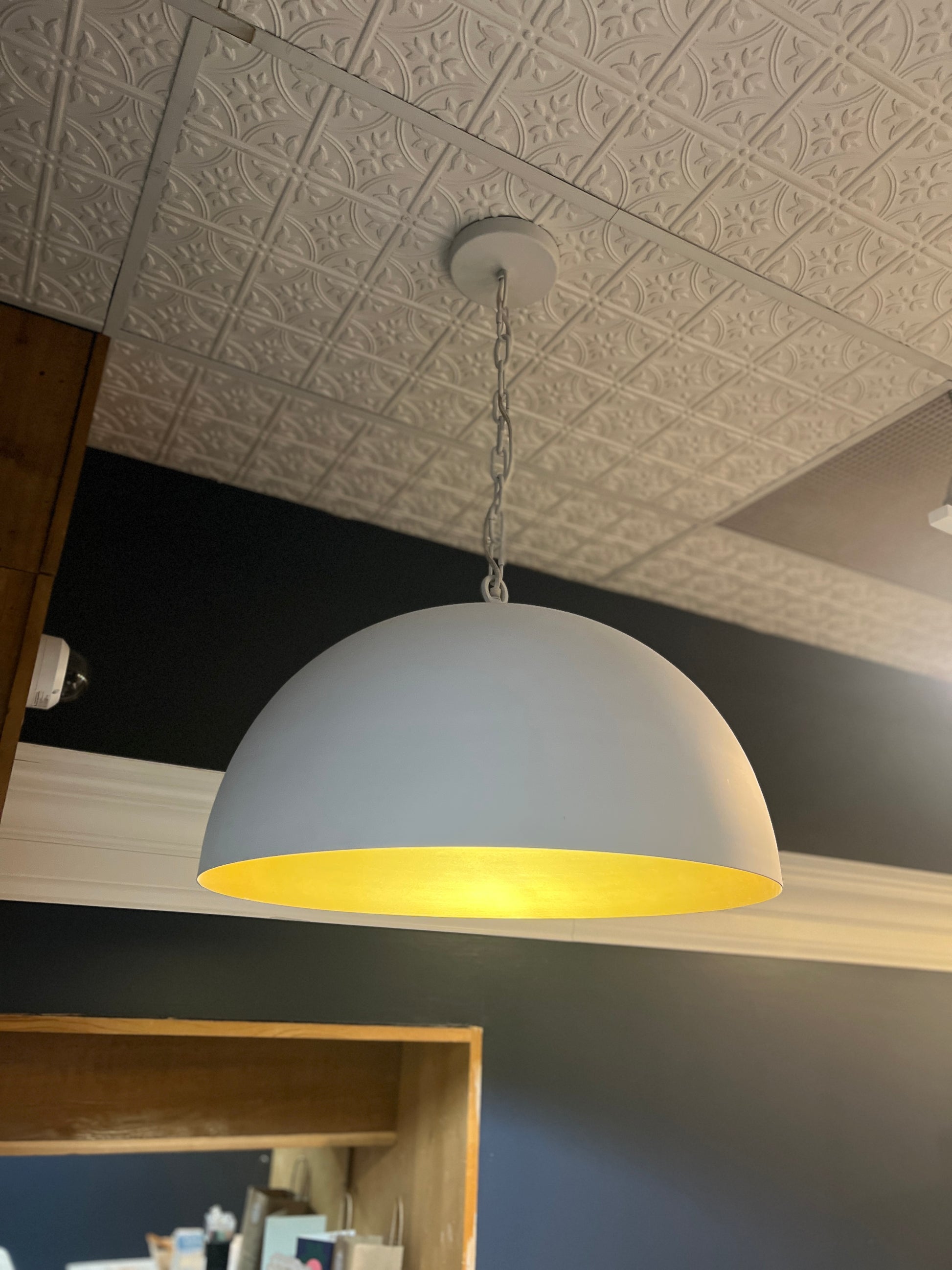The 24” Juniper Chandelier is a statement lighting piece featuring a modern dome shape. With a sleek matte white exterior, it offers a minimalist aesthetic that complements various interior styles. The inside of the shade has a warm gold finish, providing a soft, inviting glow when illuminated. Suspended by a sturdy chain, this chandelier is both stylish and functional, ideal for adding a touch of sophistication to any room. Its size and design make it suitable for use over dining tables, kitchen islands, or in entryways. 24.0L x 24.0W x 15.0H