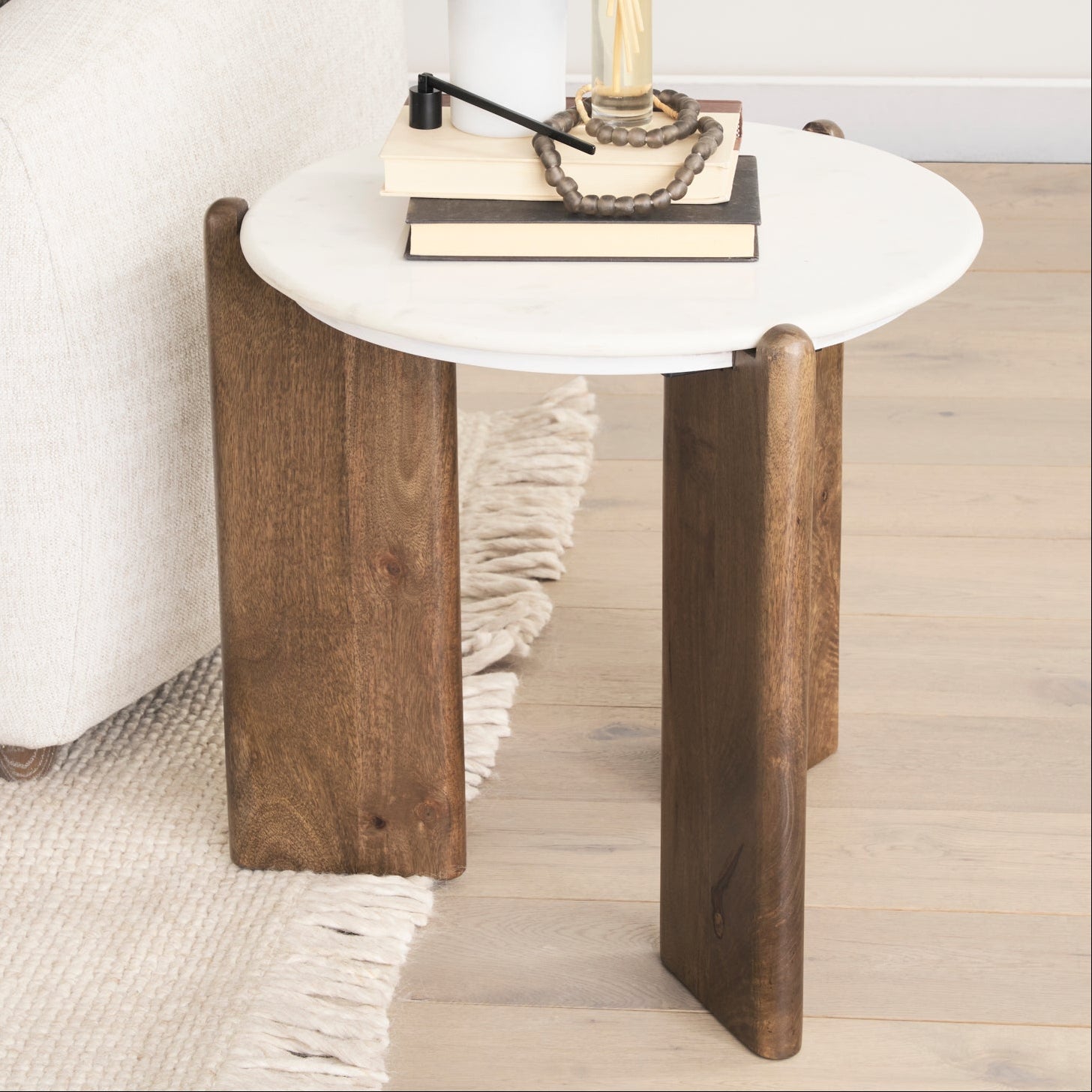 Add a touch of contemporary elegance to your space with this round accent table. Featuring a sleek white marble top, this table is supported by three curved, solid wood legs with a warm walnut finish, creating a striking blend of modern and natural aesthetics. Perfect for a living room, bedroom, or lounge area, this versatile piece is ideal for displaying décor, holding drinks, or as a stylish standalone feature. 21.0L x 21.0W x 20.0H